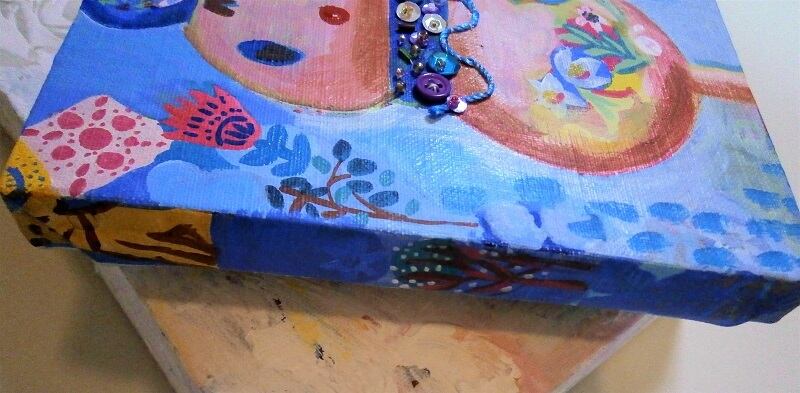 キャンバス、ジェッソ、アクリル絵の具、スパンコール、紐、ビーズ、糸