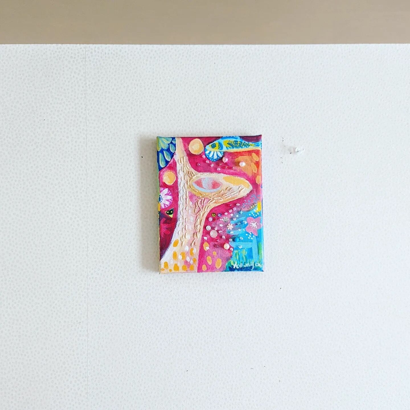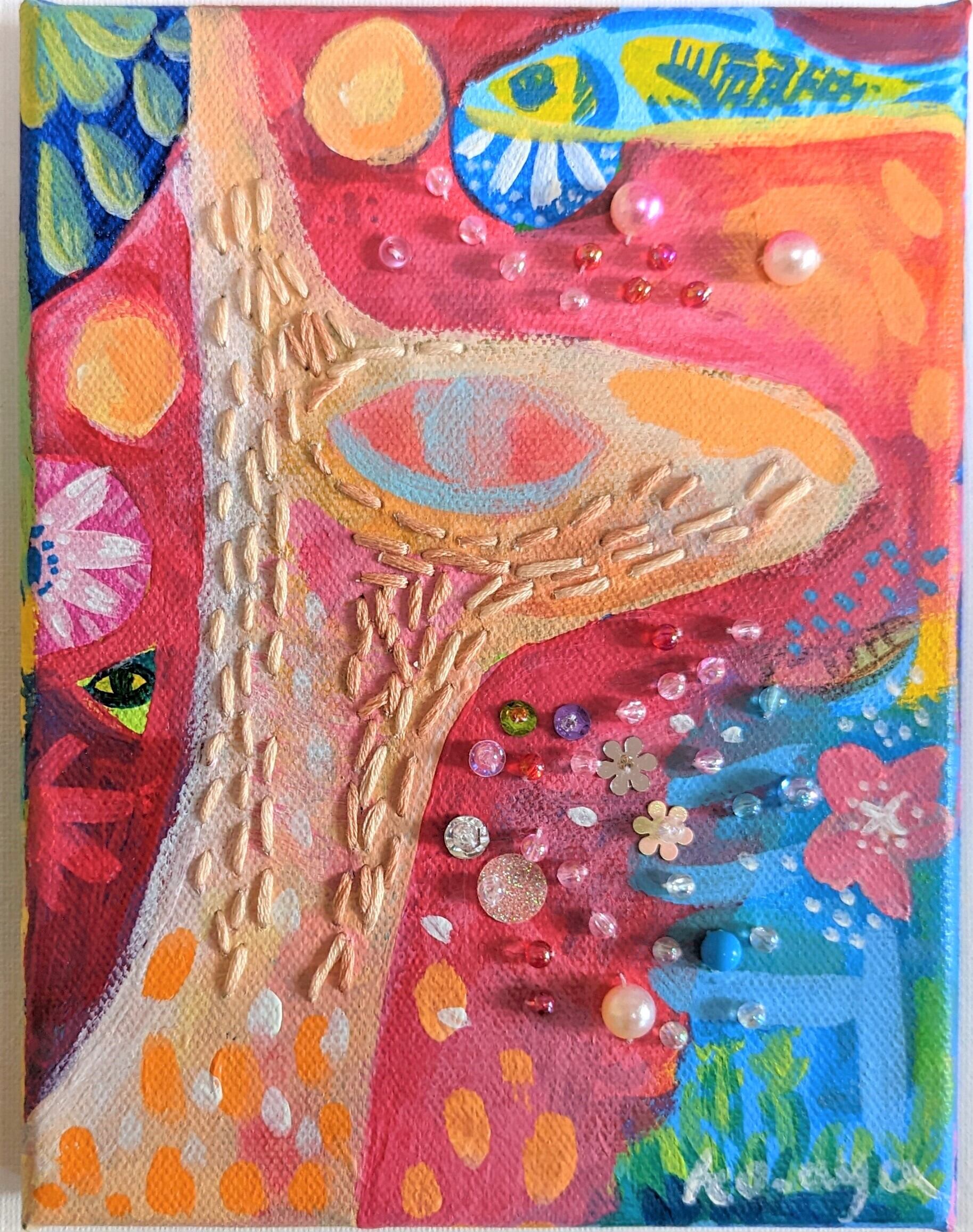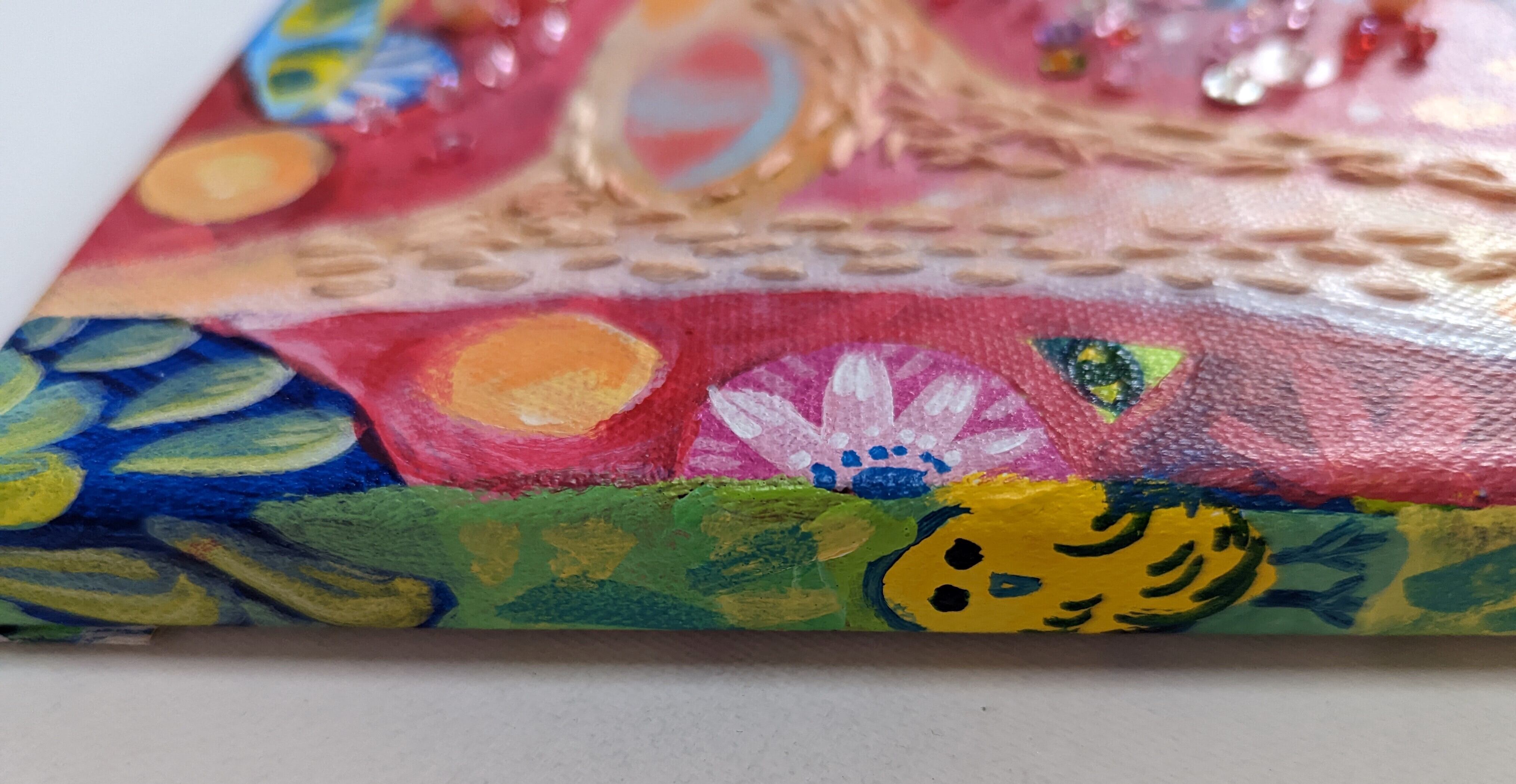 キャンバス、ジェッソ(ホルベイン)、アクリル絵の具(リキテックス、ホルベイン)、糸、スパンコール、ビーズ、ボンド(糸とめ)